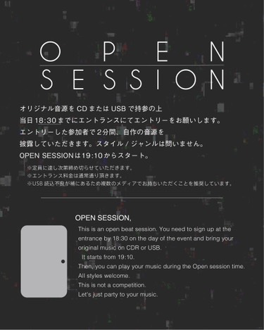 OPEN1名物の参加型セッション”OPEN SESSION”には自作の音源を持参の上、エントリーを。